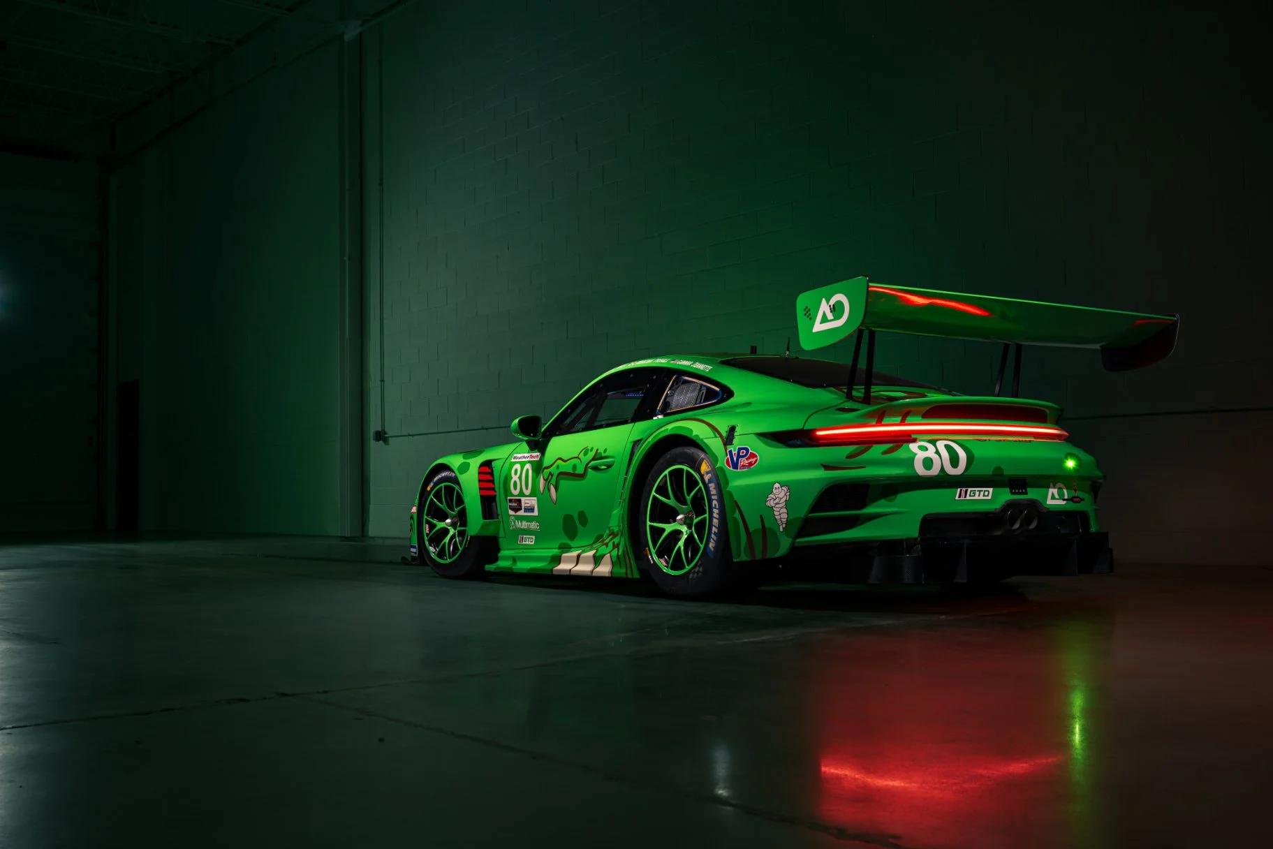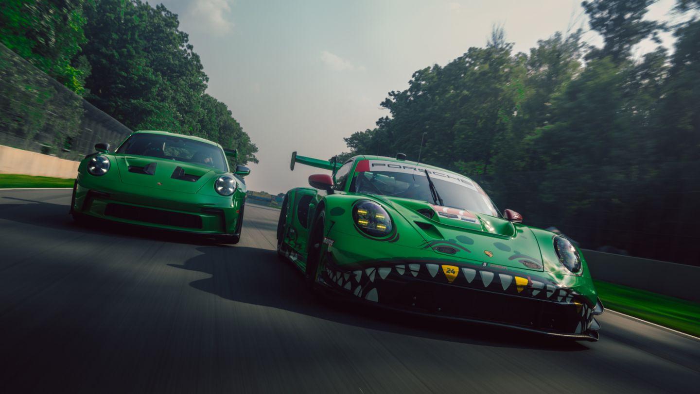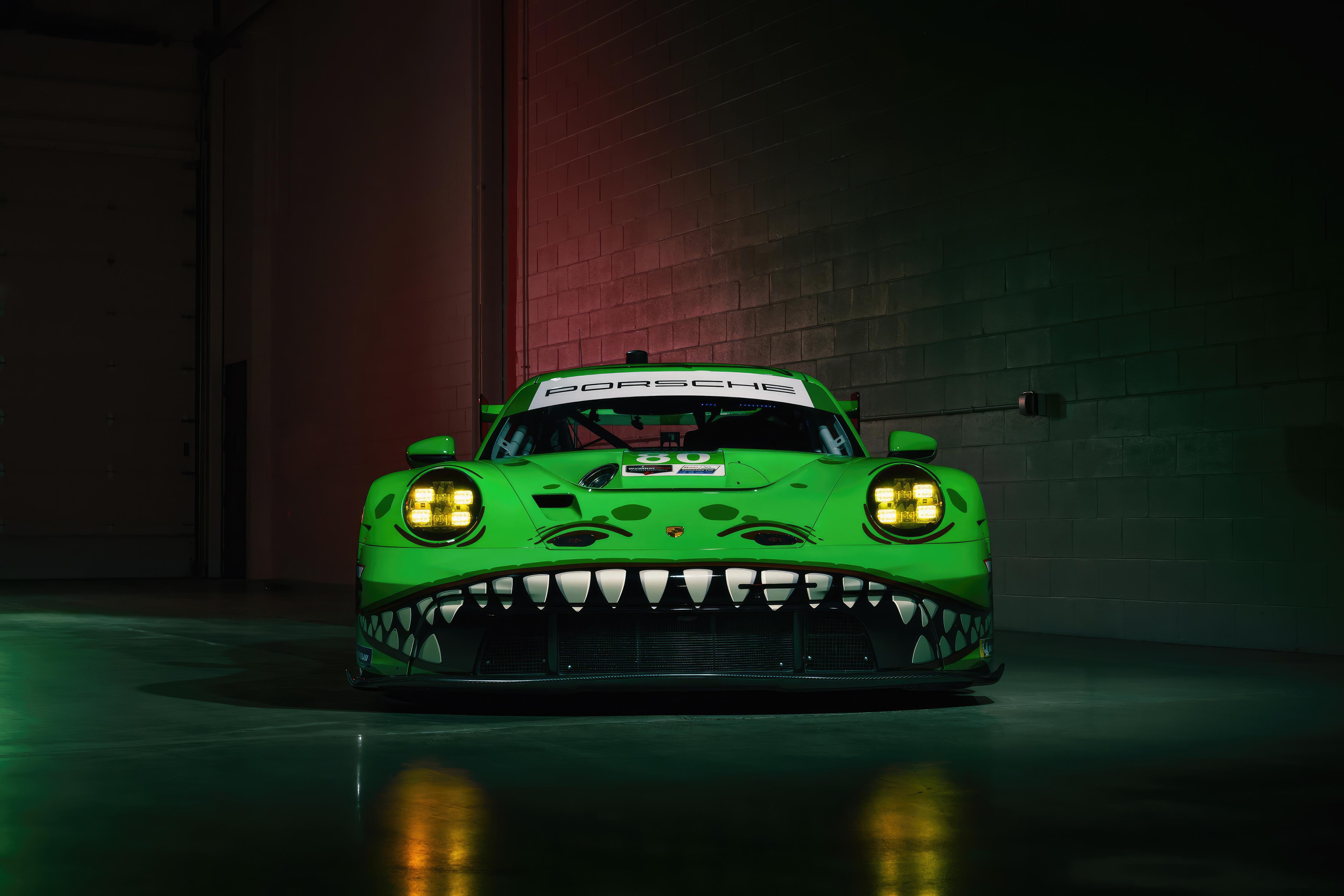 Porsche 911 gt3 with rawr livery inspired by the t-Rex girl