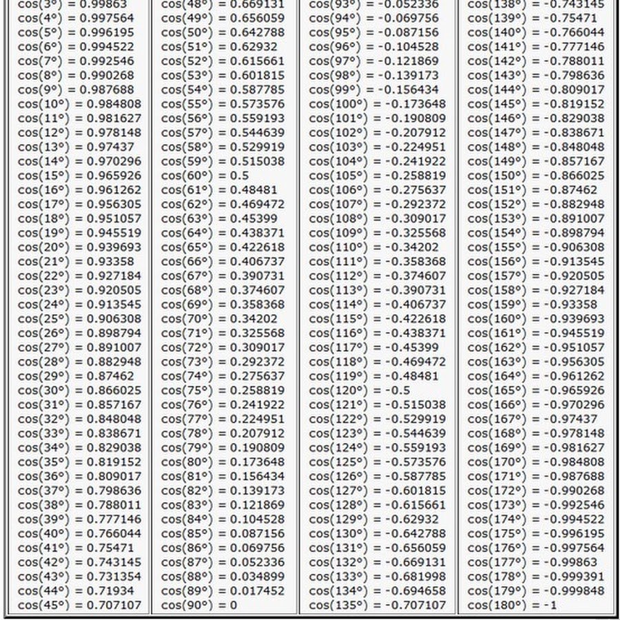 Фото Таблица синусов и косинусов от 0 до 360 градусов